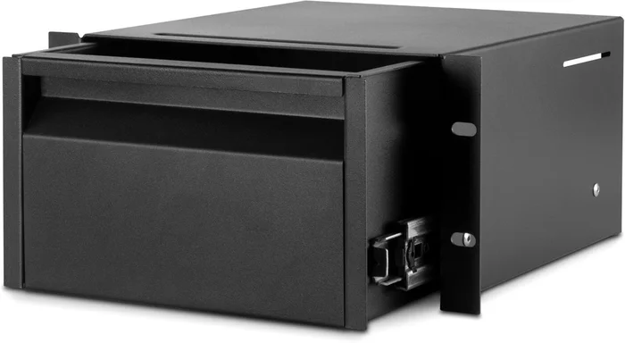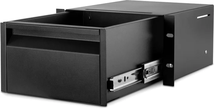 Die ERGO ist eine preisgünstige, stabil konstruierte Rackschublade aus 1,5 mm starkem Stahl mit leichter, ergonomischer Bedienenung. Ein versenkter Griff erstreckt sich über die gesamte Front. Das Zuschieben rastet die Schublade sicher ein, Ziehen am Griff löst den Mechanism zum Öffnen. Dafür sind 1,5 kg Zugkraft nötig. Die Rackschublade ist schwarz pulverbeschichtet und trägt 20 kg. Sie läuft leichtgängig auf kugelgelagerten Teleskopschienen, lässt sich vollständig ausziehen und komplett herausnehmen.