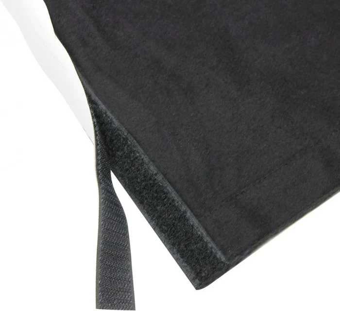 Blickdichter, schwarzer Bühnemolton in flammhemmend imprägnierter Ausstattung (B1 nach DIN 4102) und 300-Gramm-Qualität. Die Stoffe sind mit einem selbstklebenden Klettband ausgestattet , der Stoff lässt sich damit sehr einfach an Podesten oder änlichem anbringen und auch jederzeit wieder lösen.