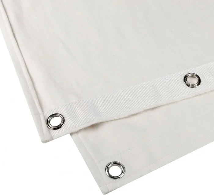 Der Stoff ist einseitig im 25-Zentimeter-Abstand geöst und mit einem zusätzlichen Gurtband hinterlegt, so dass er sich sowohl straff gespannt als auch mit lockerem Faltenwurf schnell und sicher anbringen lässt. Zum Einsatz kommen rostfrei beschichtete, brünierte Ösen mit 15 Millimeter Lochdurchmesser. Die Außenkanten sind gesäumt, die Unterkante ungesäumt, damit der Stoff schnell und einfach in der benötigten Länge selbst konfektioniert werden kann.