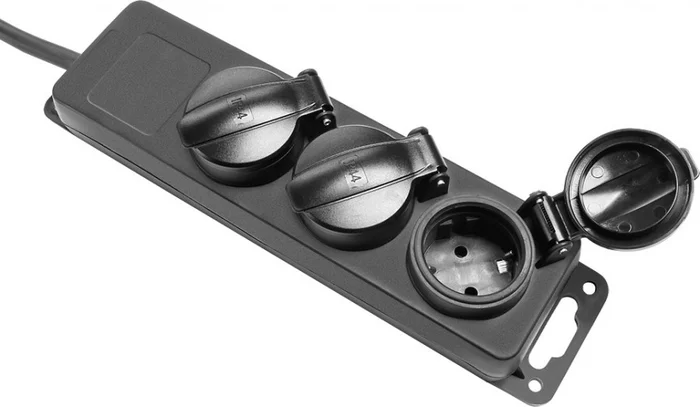 Die 8747 IP 3 ist eine 3-fach Steckdosenleiste mit 1,4 m Zuleitung und CEE 7/7 Schutzkontaktstecker. Mit ihrer Schutzart IP44 ist sie für normalen Außeneinsatz geeignet und gegen Fremdkörper über 1 mm Durchmesser und Spritzwasser geschützt.