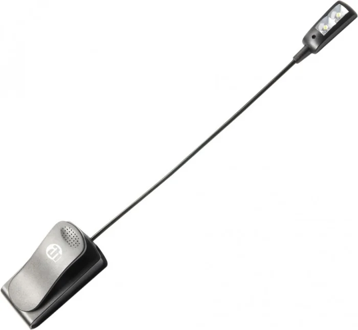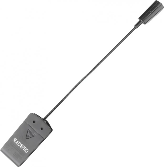 Die SLED1Pro ist eine sehr kompakte und handliche Notenpultleuchte mit geschütztem Design. Die 2 lichtstarken und effizienten LEDs sind in 2 Helligkeitsstufen einzeln schaltbar. Auch der Lichtkegel ist variabel einstellbar dank des flexiblen 220mm langen Schwanenhalses.