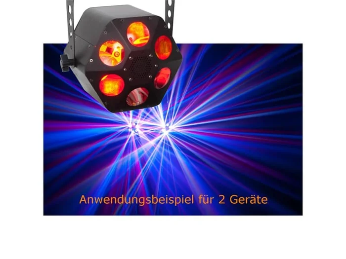 - 4 DMX-Kanäle (Farbe, Rotation, Strobe, Dimmer)