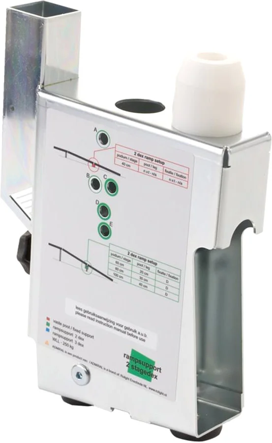 Die Admiral Ramp-Unterstützung ist eine flexible Unterstützung für den Bau einer schrägen Rampe, die an einer festen Bühne befestigt wird. Je nach Höhe der Bühne besteht die Möglichkeit, die Rampe aus zwei oder drei StageDex-Stücken zu konstruieren. Die Anzahl der aneinander gereihten StageDex und die Höhe der Bühne bestimmen die Neigung der Rampe. Die Admiral Rampenstütze ist für Bühnen mit einer Höhe von 40 cm bis 140 cm geeignet, wobei die Höhe um 20 cm zunimmt. Die Rampenstützen sind so konstruiert, dass sie immer die Standard-StageDex-Füße verwenden. Es sind drei Typen von Rampenstützen erhältlich, die viele verschiedene Kombinationen ermöglichen. Für den Bau einer Rampe mit der Admiral Rampenstütze ist ein Einhängeprofil erforderlich. Bei der Rampenstütze wird das erste Deck an der Bühne eingehängt. Stützen für 2 oder 3 Dex Abhängig von der Länge Ihrer gewünschten Rampe können Sie eine Rampenstütze für zwei oder drei Decks wählen. Sehen Sie sich unsere Bedienungsanleitung im Download-Bereich an, um Ihre Wahl zu treffen. Hinweis: Die Admiral Ramp Stützen sind dazu gedacht, eine Rampe für den Transport von Koffern und/oder anderen leichten Gegenständen zu bauen.