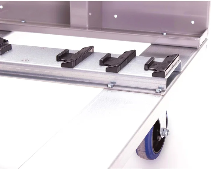 Kostengünstig und zeitsparend ermöglicht unser Stagedeck-Wagen den effizienten Transport von bis zu 6 Bühnendecks auf einmal. Dank seines ergonomischen Designs lassen sich die Bühnenelemente leicht einschieben, so dass Ihr Rücken beim Beladen des Wagens nicht übermäßig belastet wird. Der Dolly nutzt eine Gesamtfläche von 59 x 105 cm in einem LKW. Bei dieser Größe können Sie vier Wagen nebeneinander in einem Lkw unterbringen. Die Ladefläche lässt sich leicht in die Aussparungen des Wagens schieben, und eine Abschrägung an der Unterseite des Wagens verhindert, dass die Ladefläche gegen den Rücken fällt. Jedes Deck kann mit einer Schraube an der Seite des Wagens gesichert werden. Für den Transport empfehlen wir, alle Decks mit einem Gurt zu sichern. Es ist auch möglich, weitere Räder unter den Wagen zu montieren.