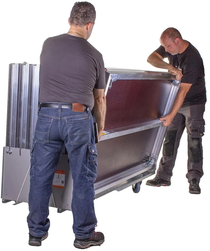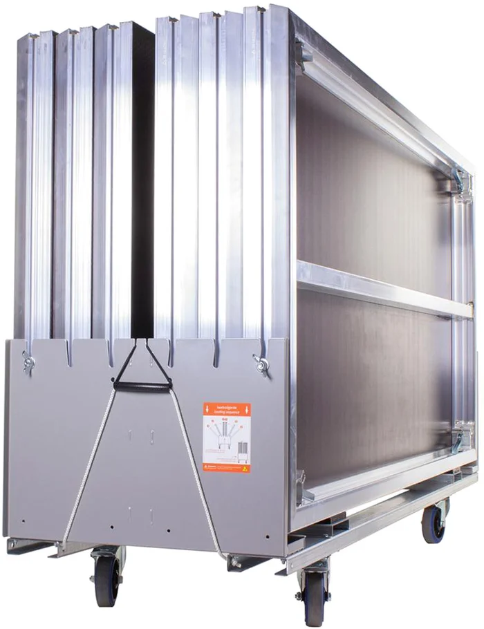 Kostengünstig und zeitsparend ermöglicht unser Stagedeck-Wagen den effizienten Transport von bis zu 6 Bühnendecks auf einmal. Dank seines ergonomischen Designs lassen sich die Bühnenelemente leicht einschieben, so dass Ihr Rücken beim Beladen des Wagens nicht übermäßig belastet wird. Der Dolly nutzt eine Gesamtfläche von 59 x 205 cm in einem LKW. Bei dieser Größe können Sie vier Wagen nebeneinander in einem Lkw unterbringen. Die Ladefläche lässt sich leicht in die Aussparungen des Wagens schieben, und eine Abschrägung an der Unterseite des Wagens verhindert, dass die Ladefläche gegen den Rücken fällt. Jedes Deck kann mit einer Schraube an der Seite des Wagens gesichert werden. Für den Transport empfehlen wir, alle Decks mit einem Gurt zu sichern. Es ist auch möglich, weitere Räder unter den Wagen zu montieren.