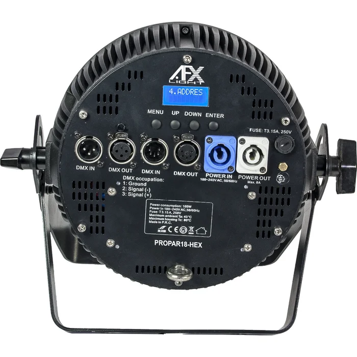 Beschreibung:Der AFX PROPAR18-HEX ist ein vielseitiger PAR Scheinwerfer mit 18×12 Watt 6in1 RGBWA+UV LEDs. Der Spot verfügt über einen 25° Abstrahlwinkel und eignet sich hervorragend zur Beleuchtung von Bühnen in Innenbereichen und sonstigen Events.