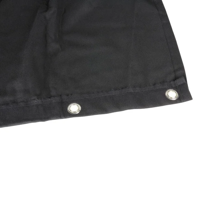 Blickdichter, schwarzer Bühnemolton in flammhemmend imprägnierter Ausstattung (B1 nach DIN 4102) und 300-Gramm-Qualität, als Vorhang, Backdrop oder zu Dekorationszwecken. Die Stoffe sind einseitig im 25 Zentimeter Abstand geöst und mit einem zusätzlichen Gurtband hinterlegt, der Stoff lässt sich damit sowohl straff gespannt als auch mit lockerem Faltenwurf schnell und sicher anbringen. Zum Einsatz kommen rostfrei brünierte Ösen mit 12 Millimeter Lochdurchmesser. Die Außenkannten sind gesäumt, die Unterkannte ungesäumt, damit kann der Stoff schnell und einfach in der benötigten Länge selbst konfektioniert werden.