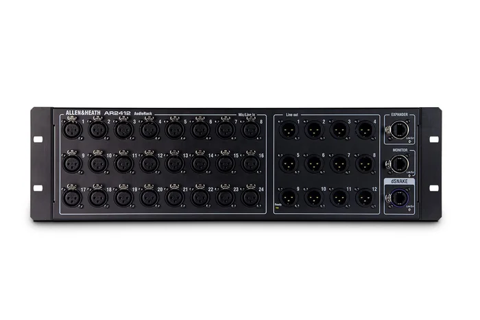 Das AR2412 von Allen & Heath ist ein 48kHz AudioRack mit 24 XLR-Eingängen und 12 XLR-Ausgängen, das mit Qu, Avantis und SQ Mixern sowie dem AHM-64 Audio-Matrixprozessor kompatibel ist. Mit dem AR2412 können Sie einige oder alle Ihrer Ein- und Ausgänge bis zu 100 m vom Mixer entfernt positionieren und über ein einziges Cat5-Kabel, das das dSNAKE-Protokoll von Allen & Heath verwendet, verbinden. dSNAKE ermöglicht die Steuerung des Remote-Vorverstärkers und alle Mikrofonvorverstärker sind wiederabrufbar. Das AR2412 verfügt auch über einen Monitor-Port für den Anschluss an ME-1 Personal Mixers und einen Expander-Port für die Reihenschaltung an ein AR84 oder AB168. Mit dem AR2412 haben Tontechniker die Möglichkeit, ihre I/O flexibel zu positionieren und die volle Kontrolle über ihre Audio-Signale zu behalten.