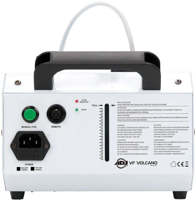 Die VF Volcano von ADJ ist eine Nebelmaschine mit vertikalem Ausstoß. Sie verfügt über 6 x 3W RGB-LEDs die den Nebel farblich akzentuieren. Durch die neu entwickelte Heizelementtechnologie von ADJ erzeugt die VF Volano einen gleichmäßigen Nebelausstoß über 4 Meter. Sie verfügt über ein spezielles Heizelement, das Verstopfungen der Leitung verhindert und über ein Hochleistungs-Pumpensystem für einen optimalen Ausstoß. Die Electronic Thermo Sensing (ETS)-Technologie von ADJ erlaubt eine optimale gleichmäßige Heiztemperatur zu gewährleisten mit kurzen Heizintervallen von nur wenigen Sekunden zwischen den Nebelausstößen.