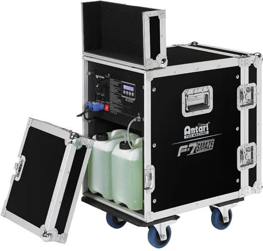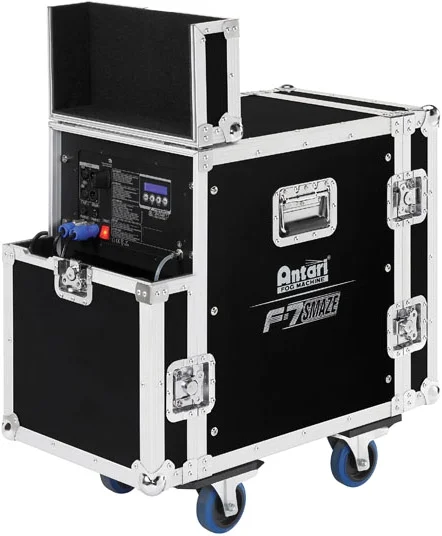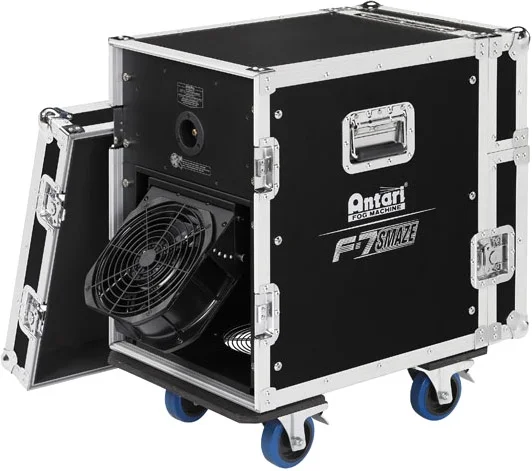 Die F-7 Smaze ist mit der neuesten Luftpumpentechnologie und einem Selbstreinigungsmechanismus ausgestattet. Dank des Flightcase-Gehäuses funktioniert die Maschine auch unter schwierigsten Bühnenbedingungen einwandfrei. Die Nebelmaschine kann manuell, per DMX und dank des integrierten WDMX-Moduls von Wireless Solutions Schweden auch kabellos gesteuert werden.Technische Daten: