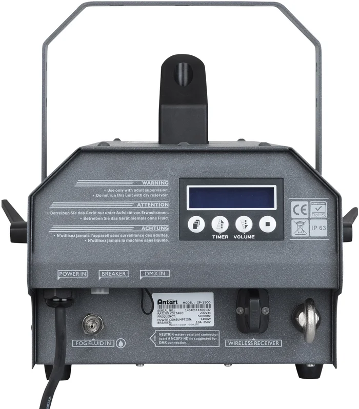 Die IP-1500 ist eine wasserfeste Nebelmaschine von Antari. Dank ihres neuen, innovativen Designs hat sie eine Schutzklassen-Note von IP63 erhalten. Ganz gleich ob drinnen oder draußen, die neue IP-1500 liefert dank ihres hochmodernen Design einen hohen Nebelausstoß bei einer Leistung von 1500W. Die Nebelmaschine ist mit einem hochpräzisen Temperaturregelsystem, einer extrem effizienten Wärmeisolierung und einem akkuraten, empfindlichen Flüssigkeitsmesssystem ausgestattet, das feststellt, wenn die Nebelausgabe oder die Flüssigkeitsversorgung absinken.Technische Daten: