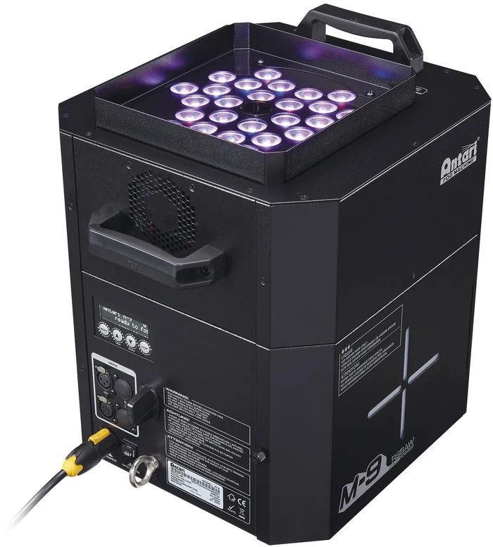 Der M-9 Jet ist Antaris fortschrittlichster CO₂-Effekt-Simulator, der je hergestellt wurde. Ein neuer, speziell entwickelter und patentierter Hochdruck-Heizblock ermöglicht es der M-9, einen simulierten CO₂-Effekt bis zu einer Höhe von 10 Metern (über 30 Fuß) zu erzeugen, ohne dass CO₂-Tanks erforderlich sind. Er ist mit hochleistungsfähigen 5-in-1-RGBAW-LEDs ausgestattet, um eine farbenfrohe Wolke in einem möglichst breiten Farbspektrum zu erzeugen. Das vielseitige Gehäusedesign ermöglicht es, die Einheit vertikal, horizontal oder umgekehrt zu montieren, ohne Angst haben zu müssen, dass sie ausläuft oder tropft, dank des speziell entwickelten Flüssigkeitstransfersystems von Antari. Zu den vielseitigen Steuerungsoptionen des M-9 gehören ein eingebauter elektronischer Timer, DMX mit RDM, Standalone-Betrieb und eine eingebaute drahtlose Fernbedienung. Das Gerät wird außerdem mit 8 vorprogrammierten farbigen Lauflichteffekten und 25 Farbmakros für eine schnelle und einfache Programmierung geliefert.Technische Daten: