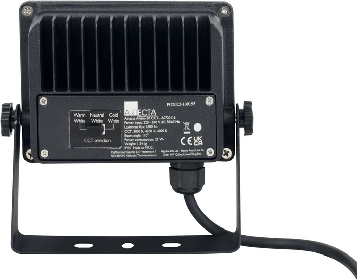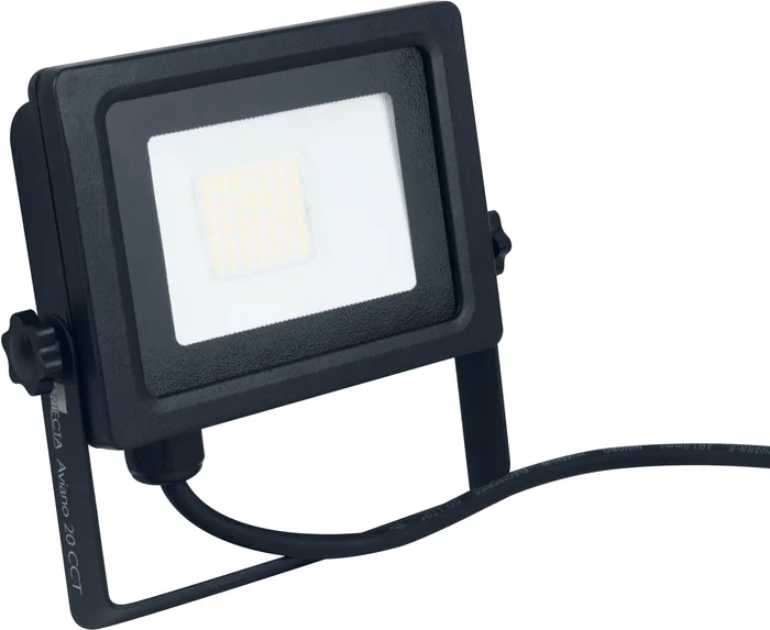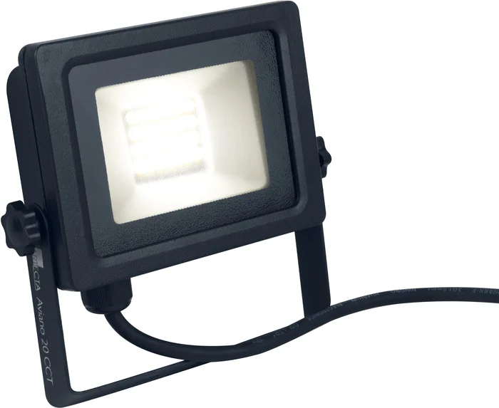 Der Artecta Aviano 20 CCT ist ein LED-Flutlicht mit einer Leistung von 20 Watt, einem Strahlungswinkel von 110° und einem Schalter zur Einstellung von Warm-, Neutral- und Tageslichtweiß (3000 K, 4200 K, 6000 K). Dieses tragbare Panel kann mit ihren 48 LEDs à 0,4 Watt zur gleichmäßigen Beleuchtung von Szenen genutzt werden. Mit seinem robusten schwarzen Design entspricht er der Schutzart IP65, sodass er auch im Freien verwendet werden kann. Es handelt sich um ein sehr zuverlässiges Plug & Play LED-Flutlicht. Im Lieferumfang sind ein 6 Meter langes Stromkabel und eine Montagehalterung enthalten.Technische Daten: