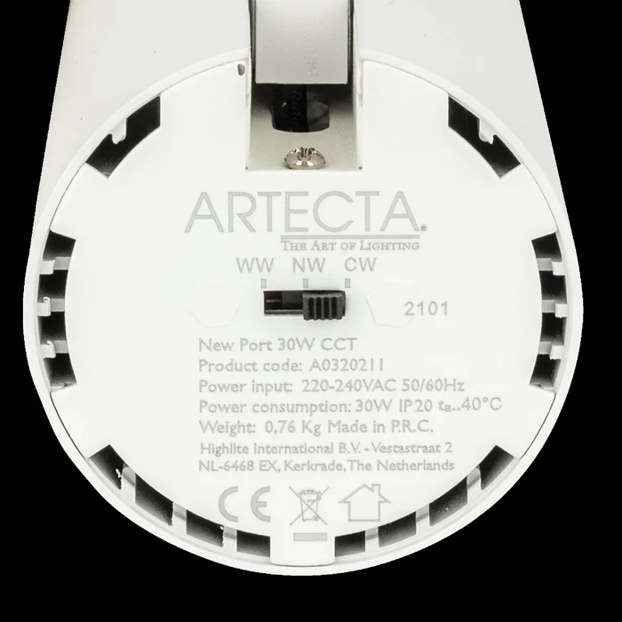 Beschreibung: Die Artecta New Port Schienenstrahler 30 W CCT ist eine dimmbare 3-Phasen Schienen LED Lampe mit 3 CCT Schalltbares Weiß. Sie verfügt über einen Schalter auf der Rückseite zur Umschaltung von einer warmweißen (2700 K) auf eine neutral- oder kühlweiße (3000 K/4000 K) Farbtemperatur. Diese Farbtemperaturen sind hoch spezifiziert (>90 CRI).