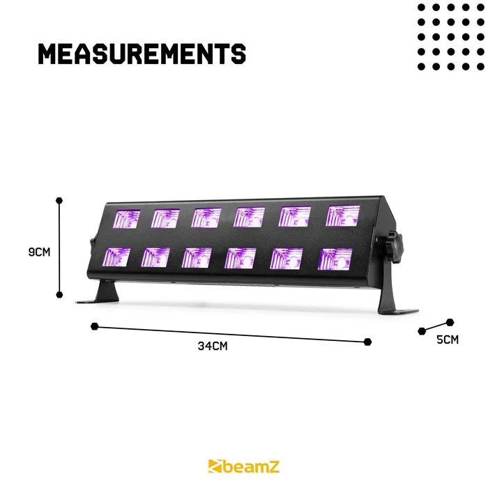 Auf der Suche nach einem Schwarzlichteffekt? Dann sind Sie beim BUV263 genau richtig. Diese UV-Schwarzlichtleiste verfügt über 12 LEDs mit einer Leistung von 3 W pro LED für einen schönen, gleichmäßigen Schwarzlichteffekt. Der BUV263 eignet sich daher perfekt für Bowlingbahnen, Cafés, Clubs, Lasergames, Escape Rooms etc.