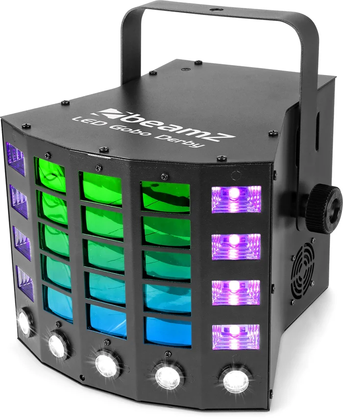 Der Gobo Derby ist ein vielseitiger 3-in-1-Scheinwerfer, der mit 8 x 3 W RGBA-LEDs, 8 x 3 W UV-LEDs und 5 x 3 W weißen LEDs mit Strobe- und Wash-Effekten ausgestattet ist. Der Gobo Derby wurde mit einem Goborad (8 Gobos) kombiniert, um eine wirklich spektakuläre Lichtshow zu bieten, die sich ideal für kleine und mittlere Anwendungen eignet, wie z.B. Hauspartys, kleine Bühnen, Dekorationen usw. Dieser kompakte und multifunktionale Scheinwerfer verfügt über DMX-Steuerung, Auto- und Soundaktivierung sowie Master/Slave-Betriebsmodi. Ein Goby-Derby-Effekt, ultraviolettes Licht und ein leistungsstarkes Stroboskop Drei Funktionen in einem Gerät! Wird mit Halterung und IR-Fernbedienung geliefert.