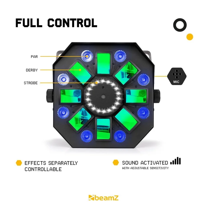 Eine komplette Lichtshow aus nur einem Gehäuse, mit dieser BeamZ MultiBox ist es möglich! Die MultiBox vereint vier Effekte (Laser, Derby, Strobo, LED-Par), die zusammen eine komplette Lichtshow ergeben.