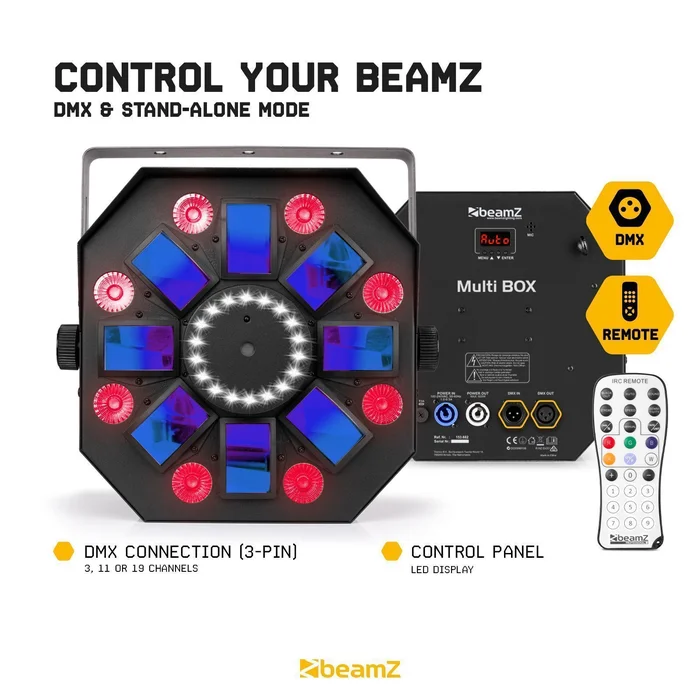 Die MultiBox ist hinsichtlich Bedienung und Steuerung in allen Märkten zu Hause. Wenn Sie Anfänger sind oder einfach nur eine coole Lichtshow auf einfache Weise haben möchten, lassen Sie es einfach auf Geräusche reagieren oder wählen Sie eines der vorprogrammierten Programme. Das geht ganz einfach mit der mitgelieferten Fernbedienung. Ein professionellerer und umfassenderer Weg ist die DMX-Steuerung, bei der Sie mit Hilfe eines separat erhältlichen DMX-Controllers die volle Kontrolle über die MultiBox haben.
