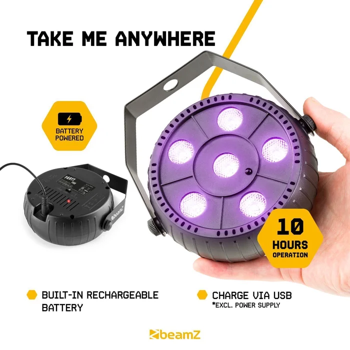 Der BeamZ PLP14 ist ein kompakter LED-Schwarzlicht-PAR mit 6 LEDs von 1 Watt pro LED. Diese LEDs bieten eine unglaubliche Lichtleistung zu einem unschlagbaren Preis. Der PLP14 ist mit einem eingebauten Akku ausgestattet, sodass Sie ihn wirklich überall einsetzen können. Das Aufladen erfolgt einfach über das mitgelieferte USB-Kabel und mit der mitgelieferten Fernbedienung können Sie das PLP14 LED-Schwarzlicht ganz einfach bedienen.