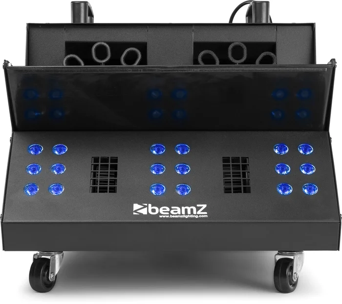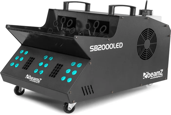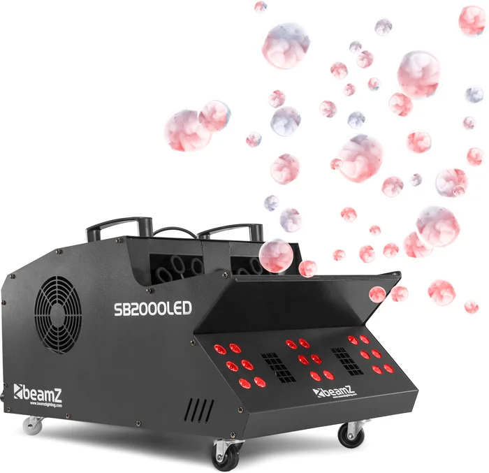 Die SB2000LED ist eine Kombination aus Nebel, Seifenblasen und 3-in-1-LEDs in einem Gehäuse. Das Doppelgebläse der SB2000-Maschine erzeugt viele Blasen, die jede Minute mit Rauch gefüllt werden und gleichzeitig einen Aufwind erzeugen, der die Blasen hoch in die Luft steigen lässt. Dieses System hat 18x 3W LEDs in den kräftigen Farben: Rot, Grün und Blau. Die SB2000 ist einfach zu laden, einfach zu bedienen und einfach zu reinigen. Am Ende der Show haben Sie dank des Flüssigkeitsablassventils keine Probleme mit der Reinigung. Der SB2000 hat zwei Griffe und eingebaute Räder, die den Transport erleichtern. Obwohl die SB2000 mit den meisten Seifenblasenflüssigkeiten betrieben werden kann, eignet sie sich am besten in Kombination mit Beamz Bubble Liquid (160.575) und Beamz Nebelfluid (160.582) für ein besonders befriedigendes und hochwertiges Seifenblasenvergnügen.