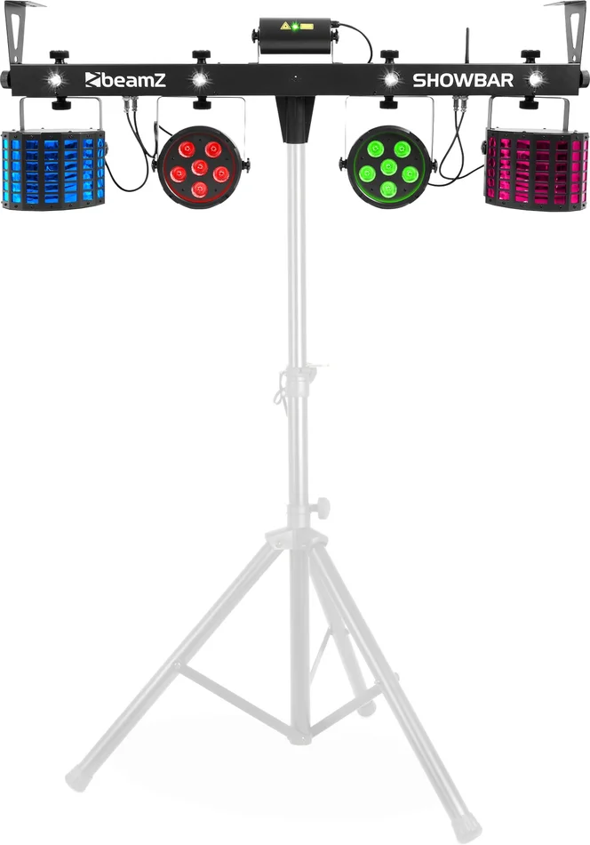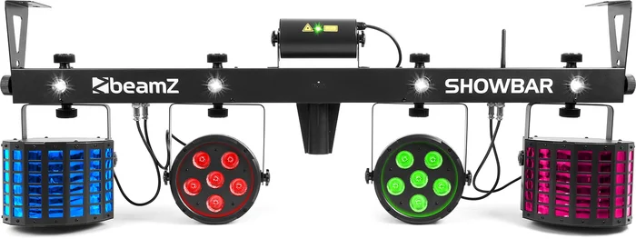 Das ultimative SHOWBAR-Kit enthält 6 Effekte, die auf einer DMX-T-Bar montiert sind. Die SHOWBAR besteht aus einem Paar LED-Schmetterlingseffekten, einem Paar LED-Paras, einem leistungsstarken grünen und roten Laser und einem Strobe-Effekt. Die T-Bar enthält 4 eingebaute weiße Hochleistungs-LEDs (1W), die einen erstaunlichen Stroboskop-Effekt erzeugen. Die T-Bar kann mit einer einfachen 2-Kanal-DMX-Einstellung, mit 9 und 18 oder 30 Kanälen gesteuert werden. Die T-Bar ist außerdem mit einem IR-Sensor für die Fernsteuerung ausgestattet. Sie können auch den drahtlosen Fußschalter verwenden, um einfach zwischen dem automatischen Modus und dem soundaktivierten Modus zu wechseln. Verknüpfen Sie mehrere Einheiten mit IEC-Stecker und DMX. Die SHOWBAR kann auf einem 38-mm-Stativ montiert werden oder mit den beidseitigen Halterungen an der Decke befestigt werden.