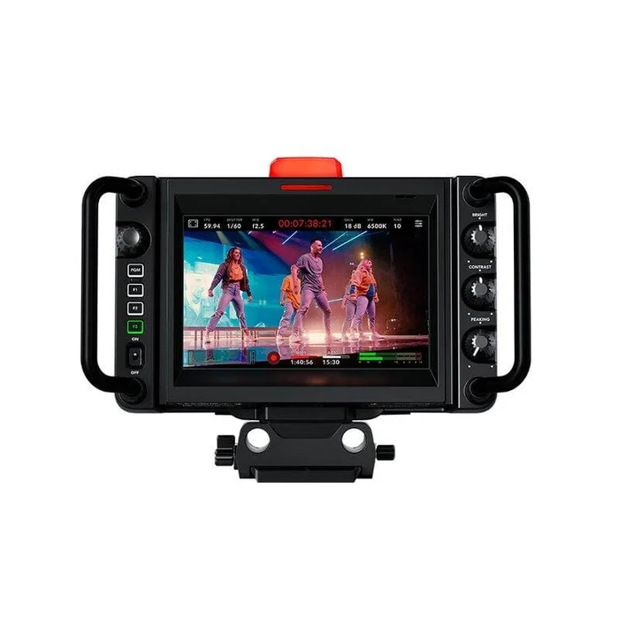 - Bedienelemente: Touchscreen für Kameraeinstellungen und -menüs sowie Einstellrad, Programmtaste, belegbare Funktionstasten F1, F2 und F3, Drehregler für Helligkeit, Kontrast und Peaking