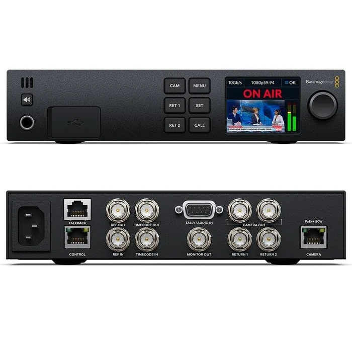 Über die 10G-Ethernet-Ports des Blackmagic Studio Converters und der Blackmagic Studio Camera 4K Pro können Sie alle Kamerasignale über die eine Ethernet-IP-Verbindung übermitteln. Demnach transportiert das eine Kabel alle Signale für Kamerafeed, Programm-Return-Feed, Timecode, Referenz, Tally, Talkback und Steuerung. Das bietet die Vorteile von SMPTE-Glasfaser, aber mit einem viel billigeren, gewöhnlichen 10G-Ethernet-Kupferkabel. Der Blackmagic Studio Converter ermöglicht die studioseitige Trennung aller Video-, Audio-und Talkback-Signale. Außerdem liefert er eine Menge Strom, der die Kamera über das Ethernet-Kabel versorgt. So brauchen Sie nicht einmal eine Stromquelle in der Nähe der Kamera.