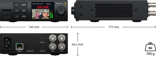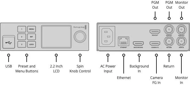 - HDMI-Anschlüsse: Background IN, Camera (ForeGround) IN, PGM (Program) OUT