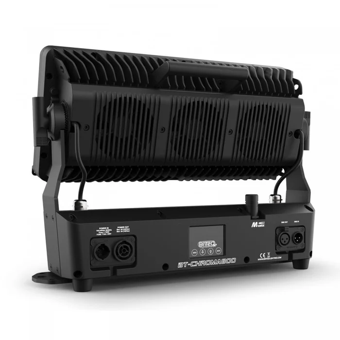 Festinstallationen: Mit dem optionalen „BT-CHROMA 800 – Install Set“ (STROM- und DMX-Eingangs-/Ausgangsmodule mit Edelstahl-Kabelverschraubungen + 2 Edelstahlbolzen für feste Neigungseinstellung) kann der Projektor sehr einfach für eine permanente Außeninstallation umgerüstet werden. - Standardmäßig ausgestattet mit 15°-Optik.