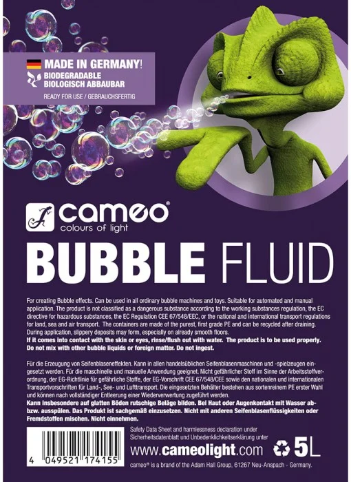 Das Bubble-Fluid von Cameo ist speziell für professionelle Seifenblasen-Maschinen formuliert und erzeugt langanhaltende, geruchsneutrale Blasen. Es ist sofort gebrauchsfertig, biologisch abbaubar und wird unter ständigen Qualitätskontrollen in Deutschland hergestellt.