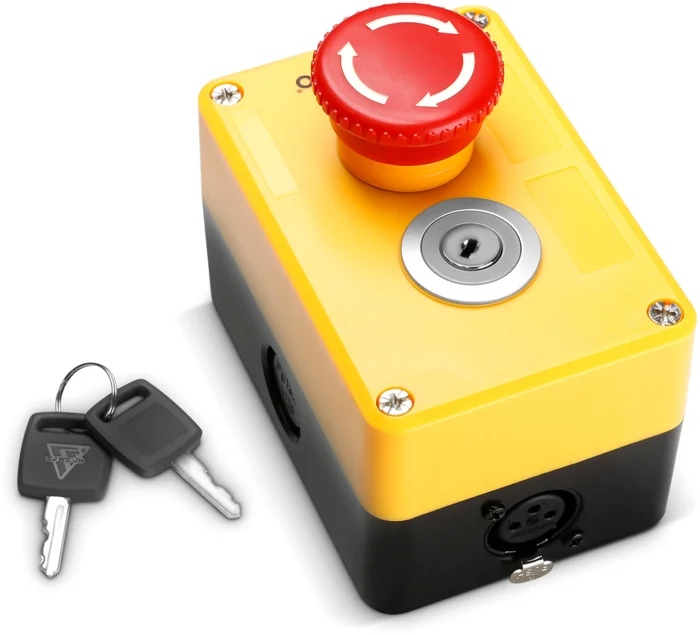 Der EKS XLR ist ein Not-Aus mit Schlüsselverriegelung zum Anschluss an den Interlock-Eingang von Lasern. Er besitzt ein stoßfestes, deutlich sichtbares gelbes Kunststoffgehäuse und einen roten Not-Aus mit Dreh-Entriegelung.
