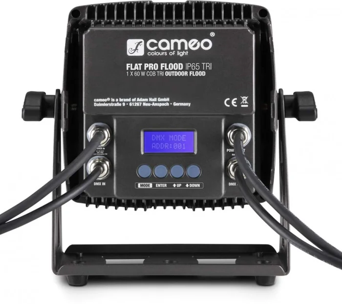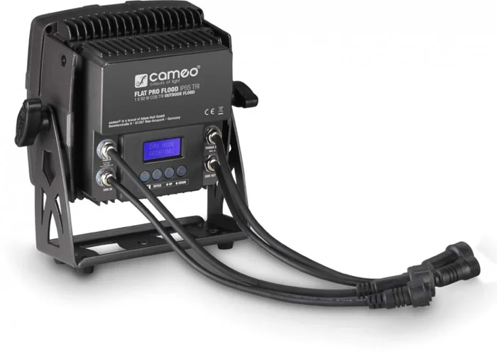 Der Cameo FLOOD IP65 TRI ist ein konvektionsgekühlter LED-Fluter aus der kompakten FLAT PRO-Serie, der für den Außeneinsatz konstruiert und mit Schutzgrad IP65 eingestuft ist. Eine 60 Watt starke Tri-Color-LED in COB-Technik liefert strahlende, natürliche RGB-Farbmischungen mit 120° Abstrahlwinkel, und die Wiederholrate von 3.000 Hz erzielt ein flackerfreies Leuchten. Das stabile schwarze Metallgehäuse des FLAT PRO Flood Light ist mit verschraubbaren DMX- und Netzanschlüssen ausgestattet, ein hinterleuchtetes Display mit vier Funktionstasten sorgt für einfache Bedienung. Der Fluter kann in den vier DMX-Modi 2-Kanal, 3-Kanal 1, 3-Kanal 2, 6-Kanal und als Master, Slave oder Standalone betrieben werden, eine Zugriffssperre verhindert die unbefugte Änderung der Einstellungen. Der Universal-Montagebügel des Cameo FLOOD IP65 TRI bietet vielseitige Befestigungsmöglichkeiten. Ein Begrenzer mit 4 Flügeln ist als Zubehör erhältlich.