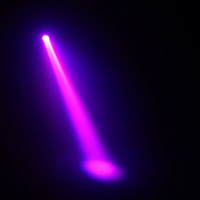 Der Q-Spot 15 wird mit einer handlichen Infrarot-Fernbedienung geliefert und bietet 5 DMX-Steuermodi, Klangsteuerung und den Einsatz als Master, Slave oder Standalone. Weitere Features sind die 20 Hz schnelle Stroboskop-Funktion, 4 optimierte Dimmerkurven und das helle Display mit 4 Knöpfen zur leichten Konfiguration. Das Metallgehäuse besitzt 3-polige DMX- und blau-weiße Netzein- und Ausgänge zur Schaltung in Serie
