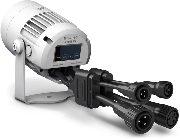 Der Q-Spot 40i verfügt über 4 DMX-Modi, Automatikbetrieb und Einsatzmöglichkeiten als Master, Slave oder Standalone. Der Scheinwerfer besitzt ein helles OLED-Display mit 4 berührungsempfindlichen Knöpfen zur leichten Konfiguration. Das robuste Gehäuse ist aus Metall und bietet 3-polige DMX- sowie Netzein- und Ausgänge, die wasserdicht verschraubbar sind und ein problemloses Hintereinanderschalten ermöglichen. Der Q-Spot 40i ist mit schwarzem (Art. Nr. CLQS40IB) oder weißem Gehäuse lieferbar (Art. Nr. CLQS40IW).