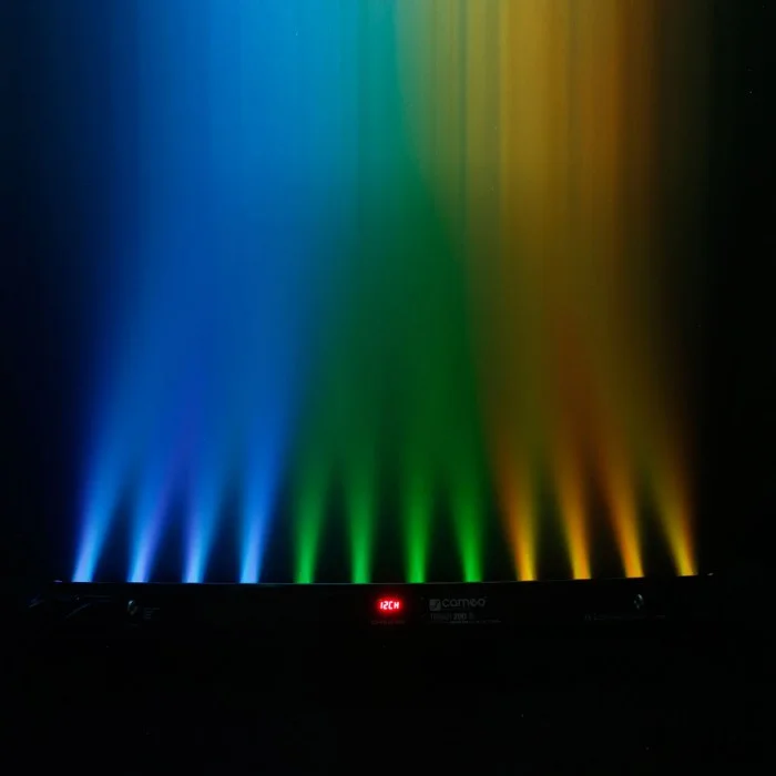 Die RGB Bar mit 20°Abstrahlwinkel kann zudem als Standalone, Master oder Slave eingesetzt werden und ist mit 12 automatisierten Programmen und einem eingebauten Mikrofon zur Musiksteuerung ausgestattet. Die Cameo TriBar 200 IR besitzt ein hinterleuchtetes Display mit 4 Funktionstasten und eine Infrarot-Fernbedienung zum komfortablen manuellen Betrieb.