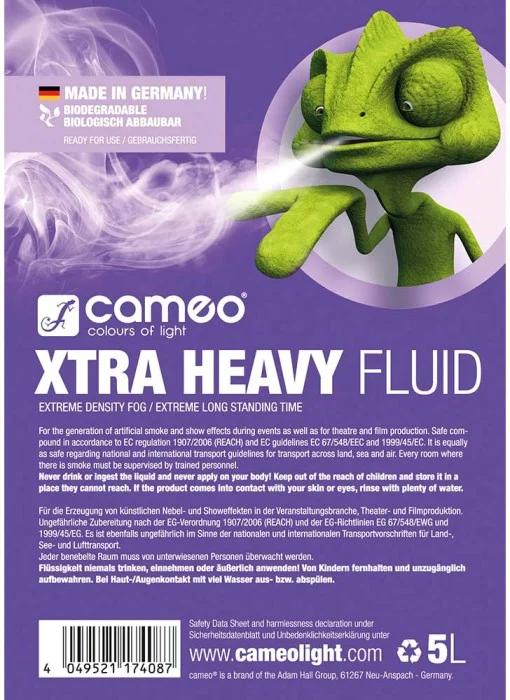 Das Cameo Xtra-Heavy Fluid ist “made in Germany“ und unterliegt ständigen Qualitätskontrollen. Es ist sofort gebrauchsfertig, geruchsneutral und biologisch abbaubar, der Kanister ist wiederverwendbar. Das Fluid ist nicht gesundheitsschädigend, eine Unbedenklichkeitsbescheinigung und das DIN-Sicherheitsdatenblatt sind als Download verfügbar.