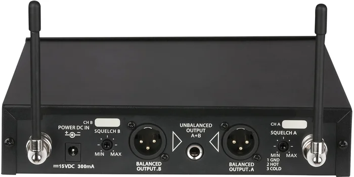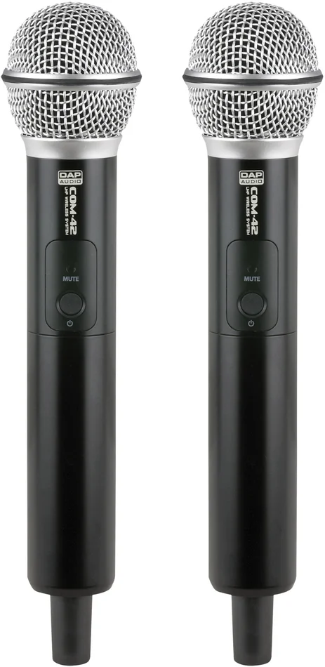 Wenn Sie zwei kabellose Mikrofone benötigen und Ihnen aber nur ein Eingang zur Verfügung steht, ist das DAP COM-42 das ideale kabellose Mikrofonset für Sie. Der kabellose Empfänger ist mit einem symmetrischen XLR-Ausgang für jeden kabellosen Transmitter sowie mit einem unsymmetrischen MIX-Ausgang für einen 6,3mm-Klinkenstecker ausgestattet. Mit den Lautstärkereglern auf der Vorderseite des Empfängers kann problemlos das gewünschte Verhältnis zwischen den beiden Transmittern eingestellt werden. Das COM-42 verfügt über 99 Frequenzvoreinstellungen, die ganz einfach über Infrarot synchronisiert werden können. Auf dem gut lesbaren LCD-Display werden die Signalstärke, die Lautstärke und die Trägerfrequenz für jeden Kanal angezeigt. Das kabellose COM-42 Mikrofonset besteht aus einem Empfänger und 2 Handtransmittern aus Metall. Es ist auch möglich, einen optionalen Gürteltransmitter zu verwenden.Technische Daten:
