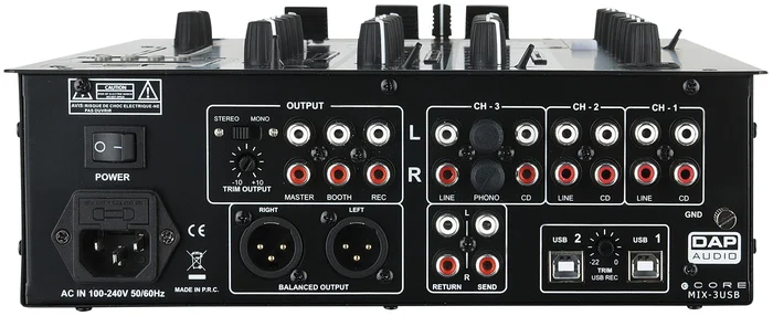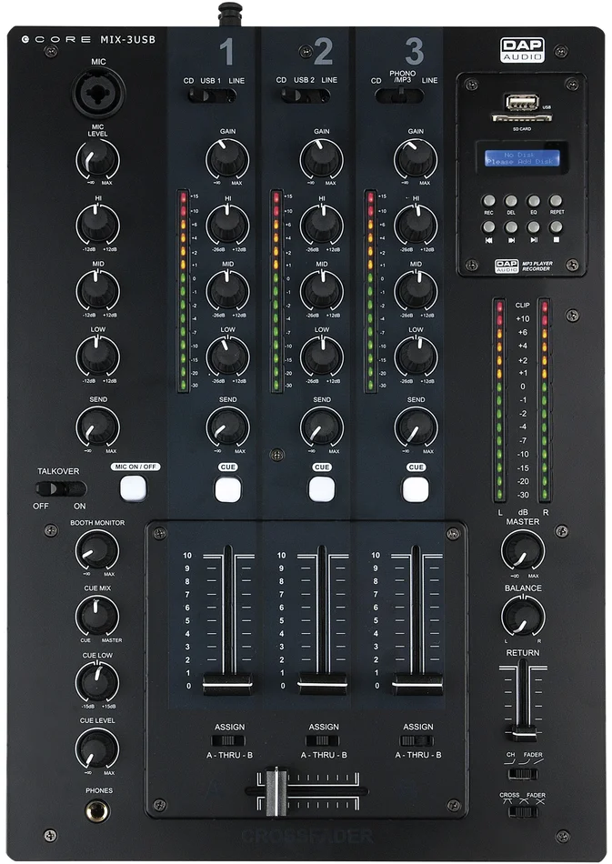 Der DAP CORE MIX-3 USB ist ein DJ-Mixer mit acht analogen Eingängen und zwei unabhängigen USB-Audioschnittstellen. Daher können Sie ihn einfach an Ihren Laptop anschließen und den Audio-Output Ihrer DJ-Software direkt durch den USB-Ausgang des MIX-3 leiten. Er verfügt über einen unabhängigen einstellbaren FX Send für jeden Kanal, sodass Sie kreativ externe Effekte nutzen können. Die Wiedergabe wird mit einem 45-mm-Fader reguliert. Der Mikrofonkanal verfügt über einen Dreiband-EQ, eine Voiceover-Funktion und einen Ein-/Aus-Schalter für sichere und einfache DJ-Aktivitäten auf Parties. Mit dem Bassregler am Kopfhörerausgang können Sie Ihren gewünschten Sound einstellen. Um zusätzliche Stabilität zu gewährleisten, sind alle Potentiometer unter der Oberfläche angebracht; ferner verfügt der Mixer über eine separate Fader-Leiterplatte, die einfach gewartet werden kann. Der Mixer ist mit unsymmetrischen und symmetrischen Ausgängen mit Trim-Funktion und einem MP3-Modul ausgestattet, mit dem Sie Ihre Live-Aufnahmen direkt auf einem USB-Gerät oder einer SD-Karte aufnehmen und wiedergeben können.Technische Daten: