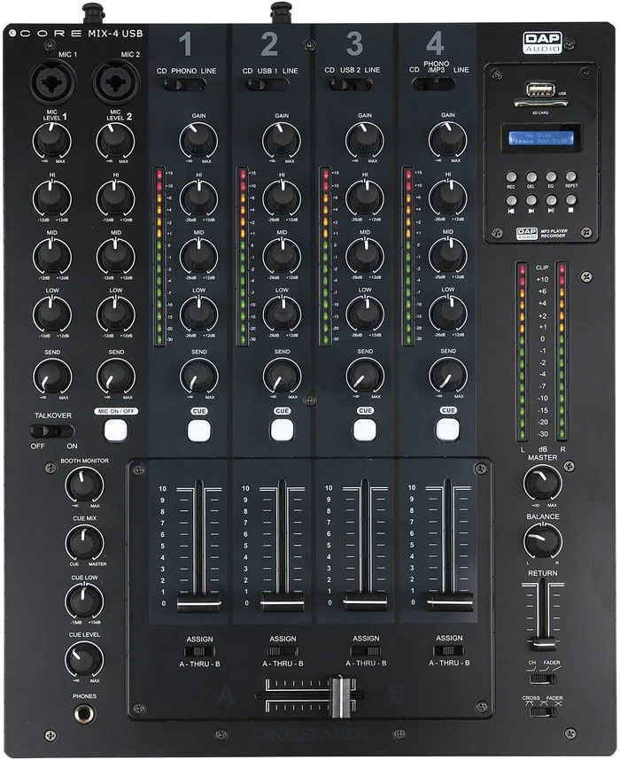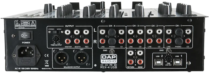 Der DAP CORE MIX-4 USB ist ein DJ-Mixer mit zwölf analogen Eingängen und zwei unabhängigen USB-Audioschnittstellen. Daher können Sie ihn einfach an Ihren Laptop anschließen und den Audio-Output Ihrer DJ-Software direkt durch den USB-Ausgang des MIX-4 leiten. Er verfügt über einen unabhängigen einstellbaren FX Send für jeden Kanal, sodass Sie kreativ externe Effekte nutzen können. Die Wiedergabe wird mit einem kurzen Fader reguliert. Der Mixer verfügt über zwei Mikrofonkanäle mit einem Dreiband-EQ, eine Voiceover-Funktion und einem Ein-/Aus-Schalter für sichere und einfache DJ-Aktivitäten auf Parties. Mit dem Bassregler am Kopfhörerausgang können Sie Ihren gewünschten Sound einstellen. Um zusätzliche Stabilität zu gewährleisten, sind alle Potentiometer unter der Oberfläche angebracht; ferner verfügt der Mixer über eine separate Fader-Leiterplatte, die einfach gewartet werden kann. Der Mixer ist mit unsymmetrischen und symmetrischen Ausgängen mit Trim-Funktion und einem MP3-Spieler/Recorder ausgestattet. Das MP3-Modul kann Ihre Live-Aufnahmen direkt auf einem USB-Gerät oder einer SD-Karte aufnehmen und wiedergeben.Technische Daten: