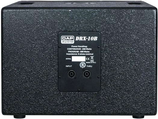 Das Gehäuse besteht aus 15 mm starkem Sperrholz mit kratzfester schwarzer Lackierung. Ein 35-mm-Stativadapter ermöglicht es, ein Abstandsrohr zwischen dem Subwoofer und dem Top-Kabinett-Lautsprecher anzubringen. In Kombination mit dem DRX-8 erzeugt der DRX-10B einen hervorragenden Sound in der vollen Bandbreite mit tollen Bässen.