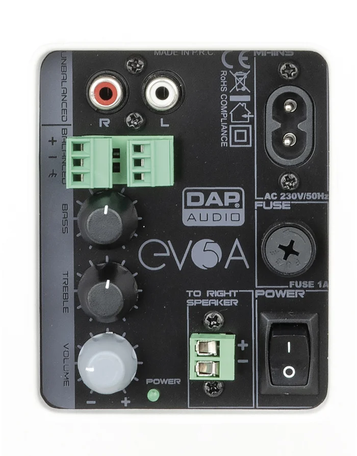Der EVO 5A verfügt über einen Verstärker der Klasse D mit Lautstärke-, Bass- und Höhenregler. Die Installation erfolgt schnell und einfach über eine Anschlussklemme und einen Cinch-Audioeingang sowie einen 8-poligen Eurostecker für die Stromversorgung. Im Lieferumfang ist eine Halterung für die horizontale und vertikale Befestigung enthalten.Technische Daten: