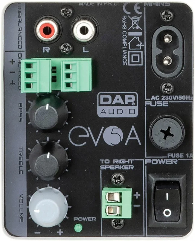 Der EVO 5A verfügt über einen Verstärker der Klasse D mit Lautstärke-, Bass- und Höhenregler. Die Installation erfolgt schnell und einfach über eine Anschlussklemme und einen Cinch-Audioeingang sowie einen 8-poligen Eurostecker für die Stromversorgung. Im Lieferumfang ist eine Halterung für die horizontale und vertikale Befestigung enthalten.Technische Daten: