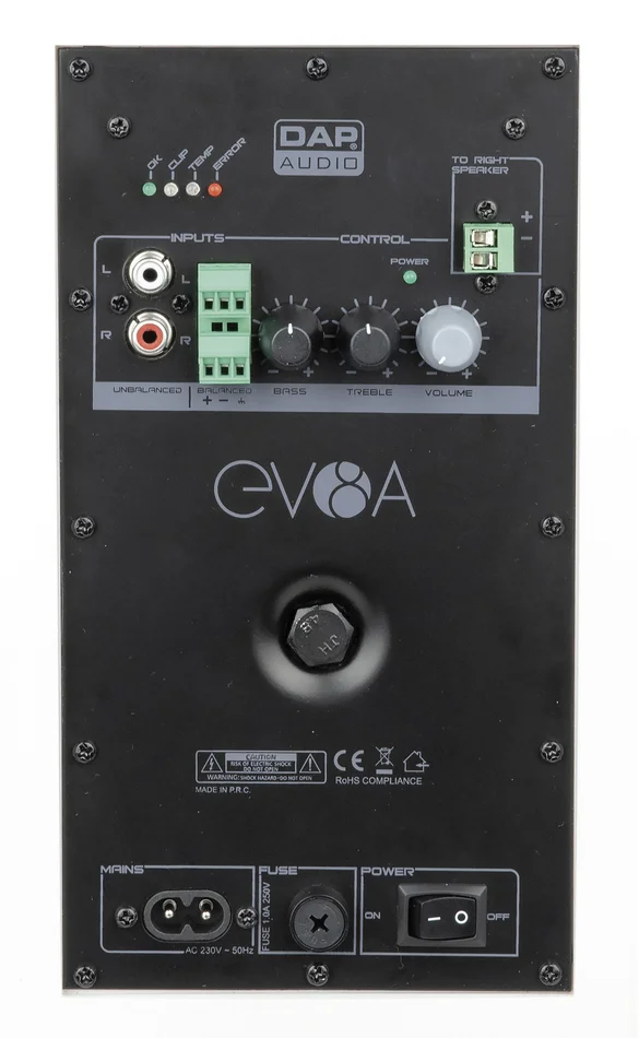 Der EVO 8A verfügt über einen Verstärker der Klasse D mit Lautstärke-, Bass- und Höhenregler. Die Installation erfolgt schnell und einfach über eine Anschlussklemme und einen Cinch-Audioeingang sowie einen 8-poligen Eurostecker für die Stromversorgung. Im Lieferumfang ist eine Halterung für die horizontale und vertikale Befestigung enthalten.Technische Daten: