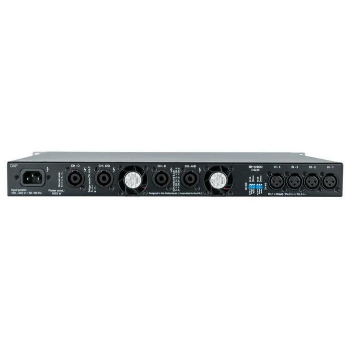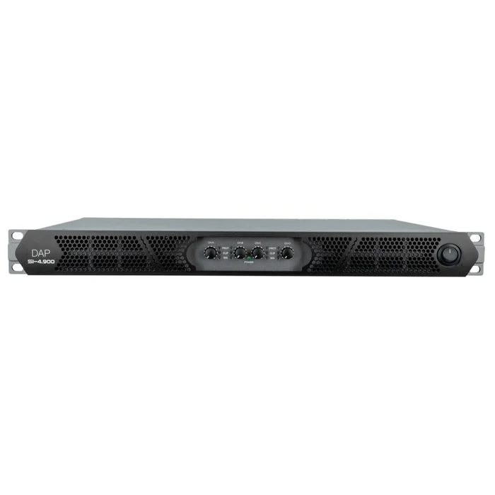 Der DAP SI-4.900 ist ein kompakter und leistungsstarker 4-Kanal-Verstärker für den fest installierten Betrieb. Im 1 HE-Rackgehäuse liefert er 4 x 900 W an 4 Ohm, kann 2-Ohm-Lasten treiben und kann für noch mehr Leistung überbrückt werden. Er ist für niedrige Impedanzen und hohe Ströme mit exzellenter Stabilität ausgelegt. Er verfügt über einen Clip-Limiter und Schutz gegen Gleichstrom am Ausgang, um Ihre Lautsprecher vor Schäden zu bewahren. Überlastungs-, Kurzschluss-, Übertemperatur- und Temperaturregelungsschutz schützen den Verstärker selbst vor Fehlfunktionen. Signal-, Clip-, Fehler- und Betriebsanzeigen informieren Sie über den Status des Verstärkers. Die Ausgangspegel können für jeden Kanal über Lautstärkeregler eingestellt werden. Der Gain lässt sich auf der Rückseite für 0,775 V Eingang oder 32 dB Gain einstellen und ein Modusschalter wählt Stereo-, Mono- und Überbrückungsbetrieb. Das universelle Schaltnetzteil mit aktiver PFC und Soft-Switching-Technologie akzeptiert Eingangsspannungen von 100 – 250 V AC und ist für den Audioleistungsverstärker optimiert.