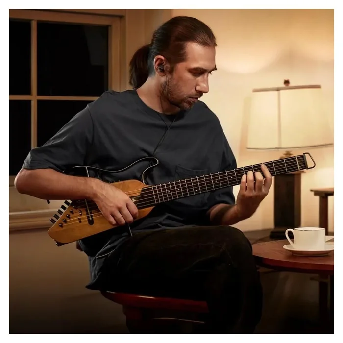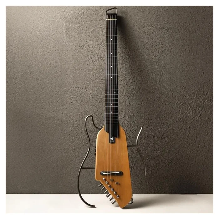 Die HUSH-I zeichnet sich durch ihr einzigartiges, kopfloses Design und den abnehmbaren Rahmen aus. Diese Konstruktion reduziert die Größe der Gitarre erheblich und minimiert gleichzeitig den akustischen Output, was sie perfekt für geräuschsensible Umgebungen macht. Trotz ihrer kompakten Größe bietet die HUSH-I eine volle Mensur, sodass sich Gitarristen sofort wohlfühlen und ohne Umgewöhnung spielen können. Die abnehmbaren Stützen geben dem Spieler das Gefühl, eine normale akustische Gitarre in der Hand zu halten.