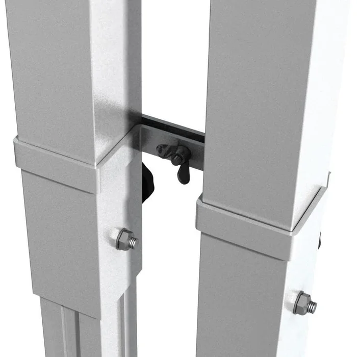 Mit der Duo Leg Clamp können zwei Plattformfüße verbunden werden. Die Halterung absorbiert die auf den Bühnenboden wirkenden Kräfte in horizontaler und vertikaler Richtung und stabilisiert Stufen mit großen Bauhöhen.