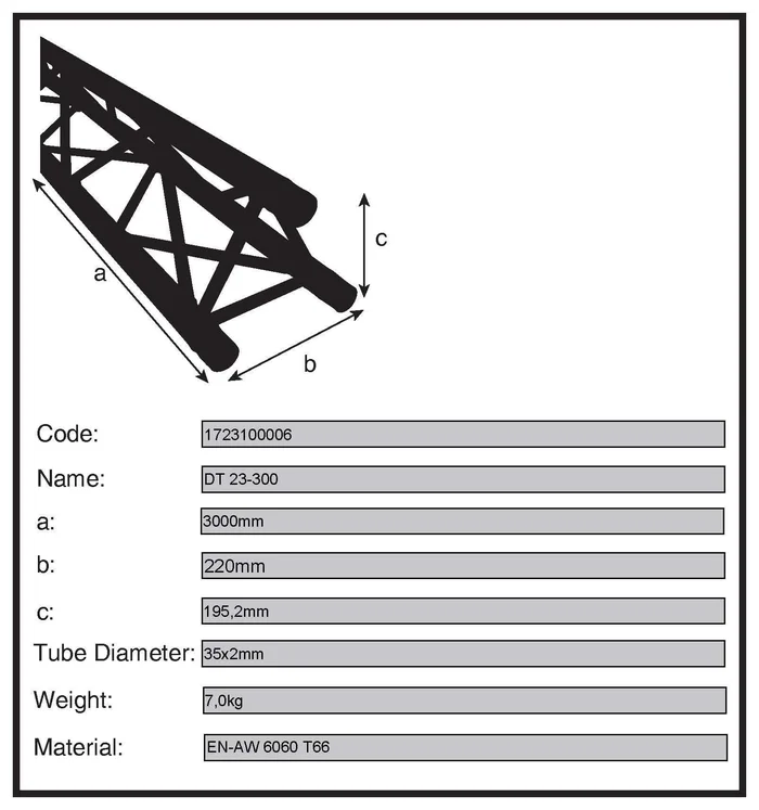 Die DT23-Serie ist ein 3-Punkt-Traversensystem mit konischer Kupplung (Zapfen), Traversenspin und Sicherungsclip. Dieses Schnellverschlusssystem schließt kraftschlüssig mit dem Gurtrohr und ermöglicht einen schnellen Aufbau bei häufigem Auf- und Abbau. Die drei Hauptrohre bestehen aus 35mm Aluminiumrohr mit einer Wandstärke von 2mm und verleihen diesem System ein hervorragendes Verhältnis von Festigkeit zu Gewicht. Die Streben haben einen Durchmesser von 8 mm. Jedes Traversenstück enthält alle erforderlichen konischen Verbinder, Stahlstifte und Sicherheitsclips.