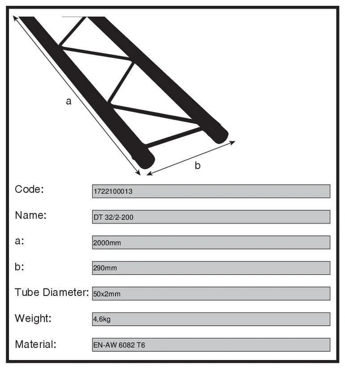 Die DT32/2-Serie ist ein 2-Punkt-Traversensystem mit konischer Kupplung (Zapfen), Traversenspin und Sicherungsclip. Dieses Schnellverschlusssystem schließt kraftschlüssig mit dem Gurtrohr und ermöglicht einen schnellen Aufbau bei häufigem Auf- und Abbau. Die Hauptrohre bestehen aus 50 mm Aluminiumrohr mit einer Wandstärke von 2 mm und verleihen diesem System ein hervorragendes Verhältnis von Festigkeit zu Gewicht. Die Streben haben einen Durchmesser von 20 mm bei einer Wandstärke von 2 mm. Jede Traversenlänge enthält alle notwendigen konischen Verbinder, Stahlstifte und Sicherheitsclips.