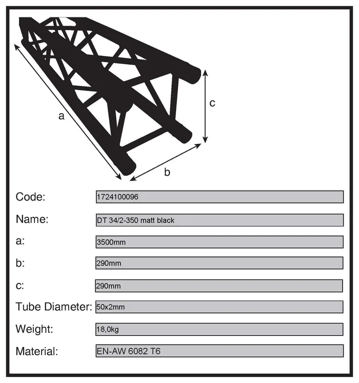 Das DT34/2 Black System ist ein mattschwarz (RAL 9005) pulverbeschichtetes 4-Punkt-Traversensystem, das mit konischen Verbindern, Bolzen und Sicherungsstiften verbunden wird. Dieses Schnellverschlusssystem schließt kraftschlüssig mit dem Gurtrohr und ermöglicht einen schnellen Aufbau bei häufigem Auf- und Abbau. Die Hauptrohre bestehen aus 50 mm Aluminiumrohr mit einer Wandstärke von 2 mm und verleihen diesem System ein hervorragendes Verhältnis von Festigkeit zu Gewicht. Die Streben haben einen Durchmesser von 20 mm bei einer Wandstärke von 2 mm. Jedes Traversenstück enthält alle erforderlichen konischen Verbinder, Stahlstifte und Sicherheitsclips.