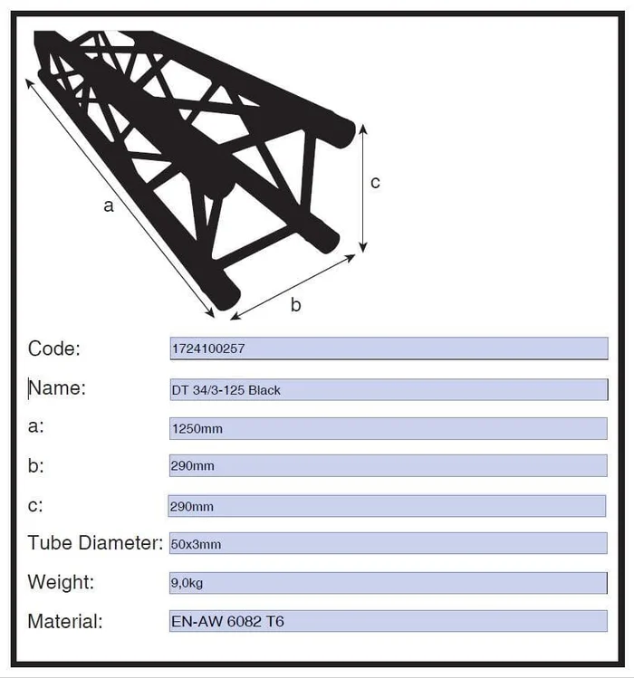 Das DT34/3 Black System ist ein mattschwarz (RAL 9005) pulverbeschichtetes 4-Punkt-Traversensystem, das mit konischen Verbindern, Bolzen und Sicherungsstiften verbunden wird. Dieses Schnellverschlusssystem schließt kraftschlüssig mit dem Gurtrohr und ermöglicht einen schnellen Aufbau bei häufigem Auf- und Abbau. Die Hauptrohre bestehen aus 50mm Aluminiumrohr mit einer Wandstärke von 3mm und verleihen diesem System ein hervorragendes Verhältnis von Festigkeit zu Gewicht. Die Streben haben einen Durchmesser von 20 mm bei einer Wandstärke von 2 mm. Jedes Traversenstück enthält alle erforderlichen konischen Verbinder, Stahlstifte und Sicherheitsclips.